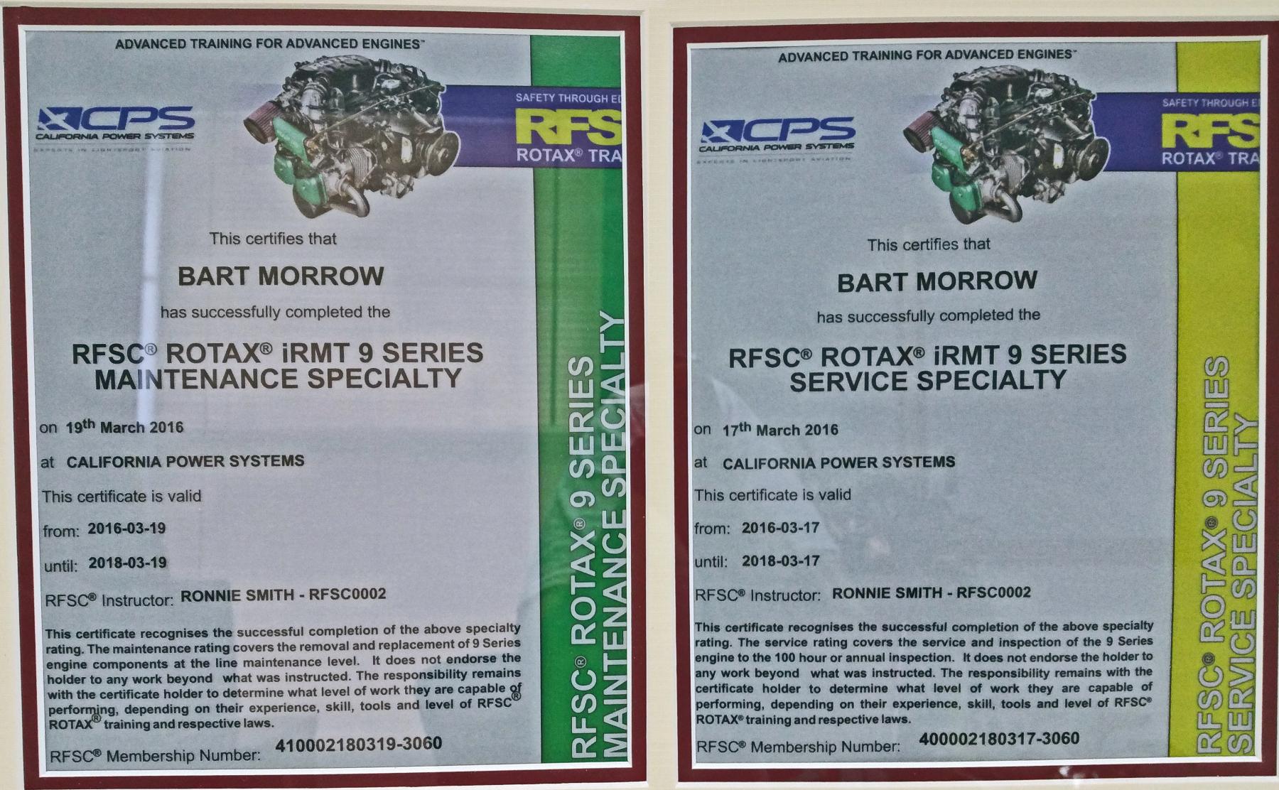 Our very own Bart Morrow attended a Rotax Class at California Power Systems in Corona, CA and got his certification to work on Rotax IRMT 9 SERIES engines! Congrats Bart!
